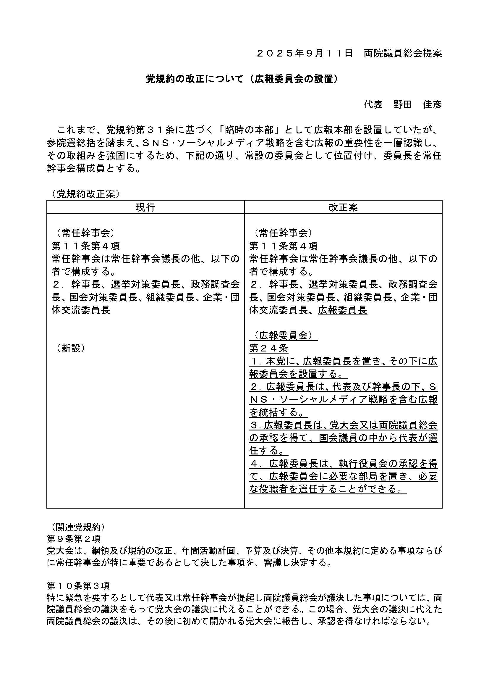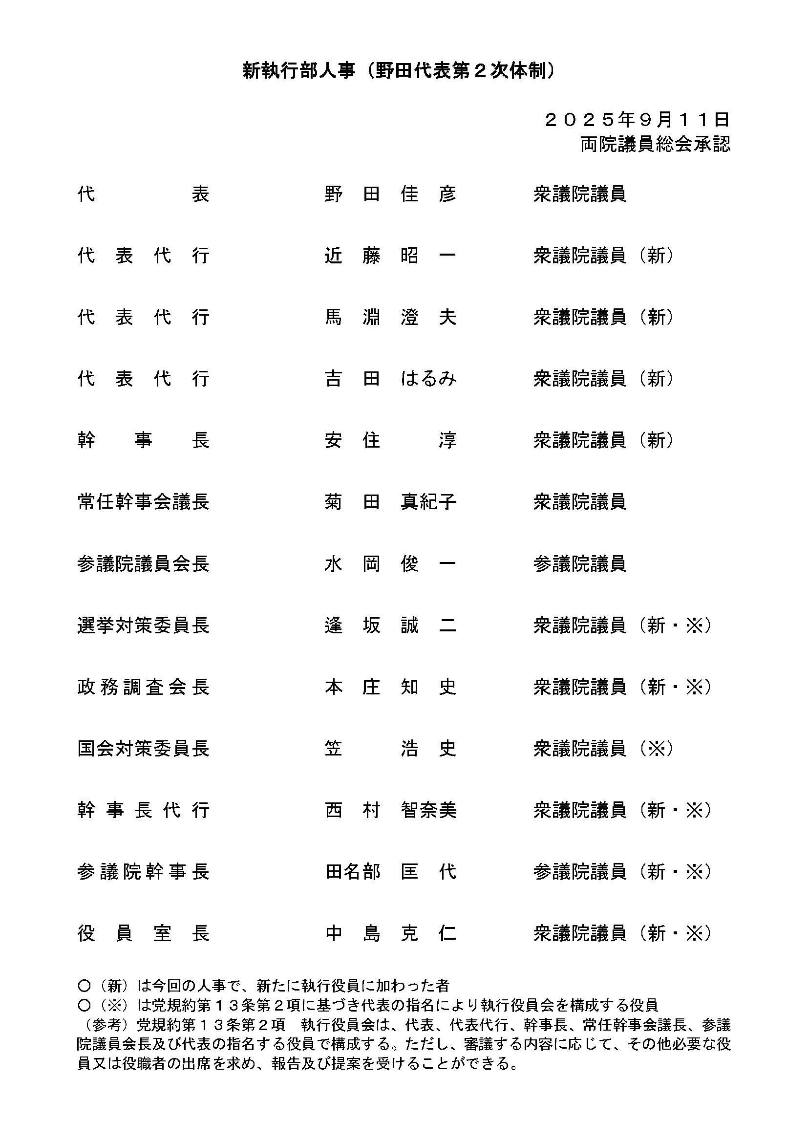 立憲民主党は9月11日、両院議員総会(会長:牧山ひろえ参院議員)を党本部で開き、野田佳彦代表は(1)党役員人事(2)広報委員会に係る党規約の改正(3)広報委員長の選任について提案し、拍手をもって了承されました。